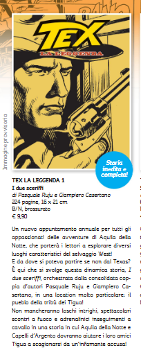 Italiassa käynnistyy tänä vuonna uusi Tex Willer -sarja nimeltä ”Tex – legenda”. Ensimmäinen osa on 224-sivuinen, mustavalkoinen ja Maxi-Texin kokoinen.